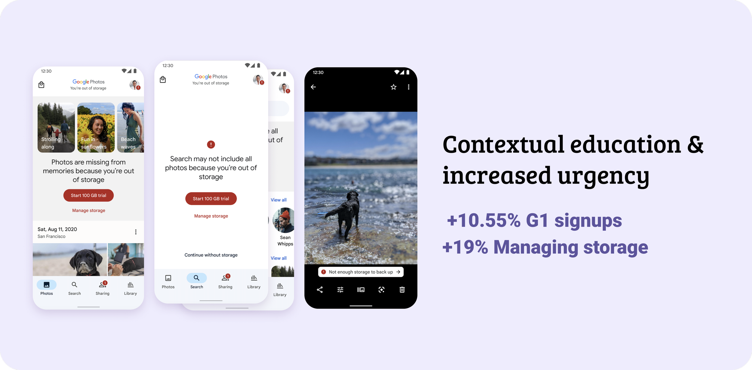 We ran an experiment to validate headroom of adding more contextual UI. We designed big and bold banners on two surfaces that were the most impacted (Memories and Search). This project was meant to be a learning experiment that never launched. However, because it was so successful in getting users to manage storage or subscribe to Google One while not decreasing our guardrail metrics, it ended up launching to the public.