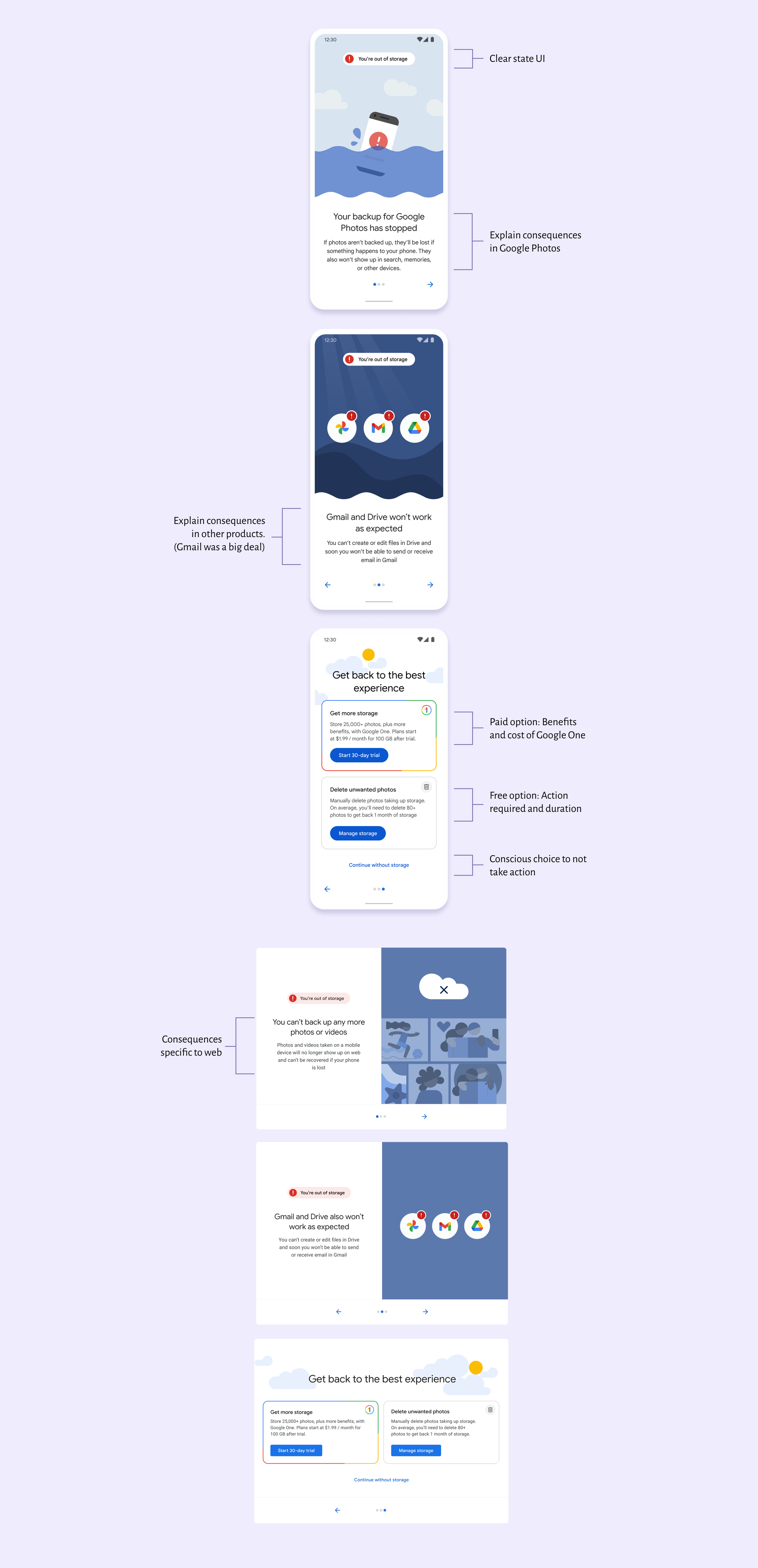 Many users were ignoring this state and had banner blindness from our current banners on the grid. However, in user testing when users learned that Gmail would stop working or photos were at risk of being lost, we increased the urgency for them to take action.