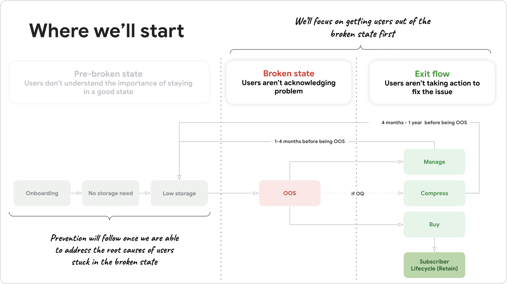 The analytics team created an analysis of users currently out-of-storage. Understanding how users behaved was key to developing the strategy. We found that users usually purchased Google One after the 2nd attempt at managing storage, validating that managing storage is only a short-term solution to the problem.